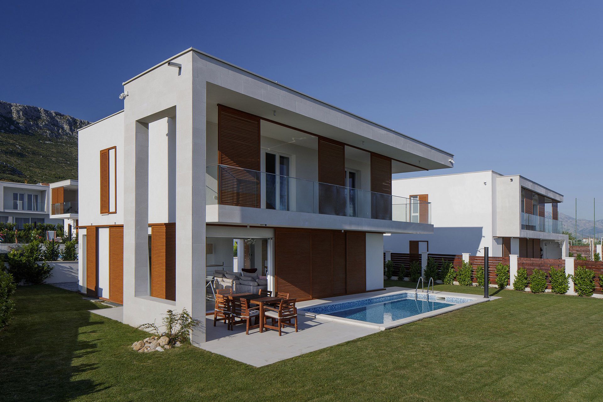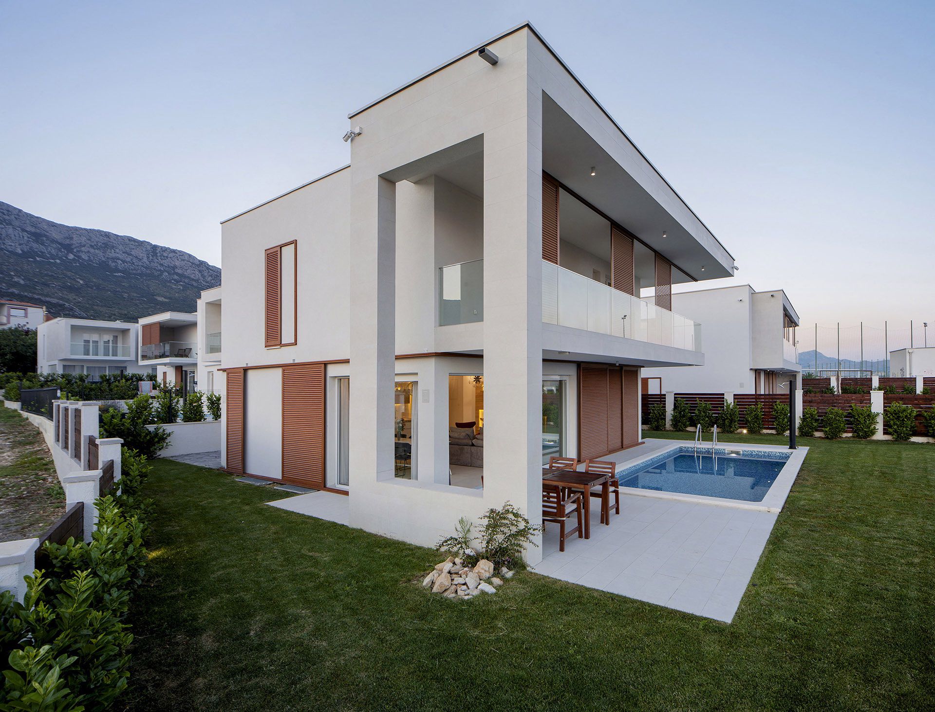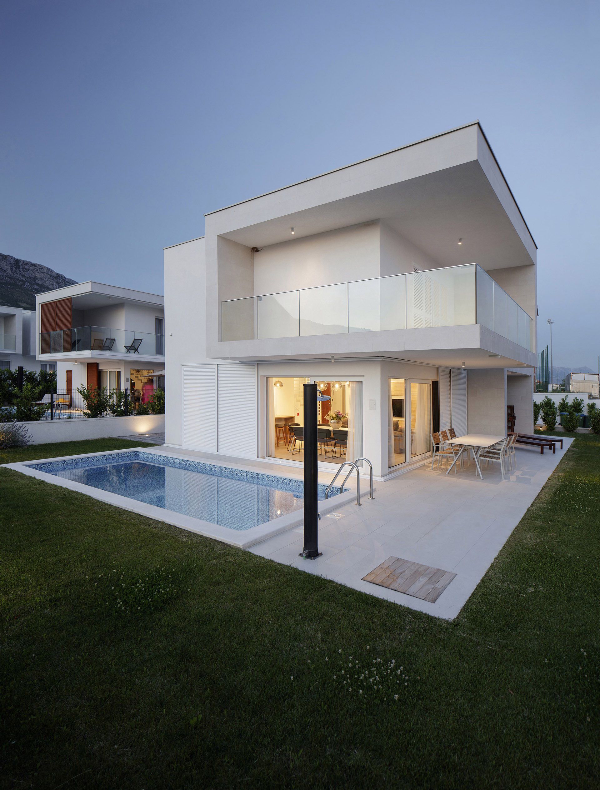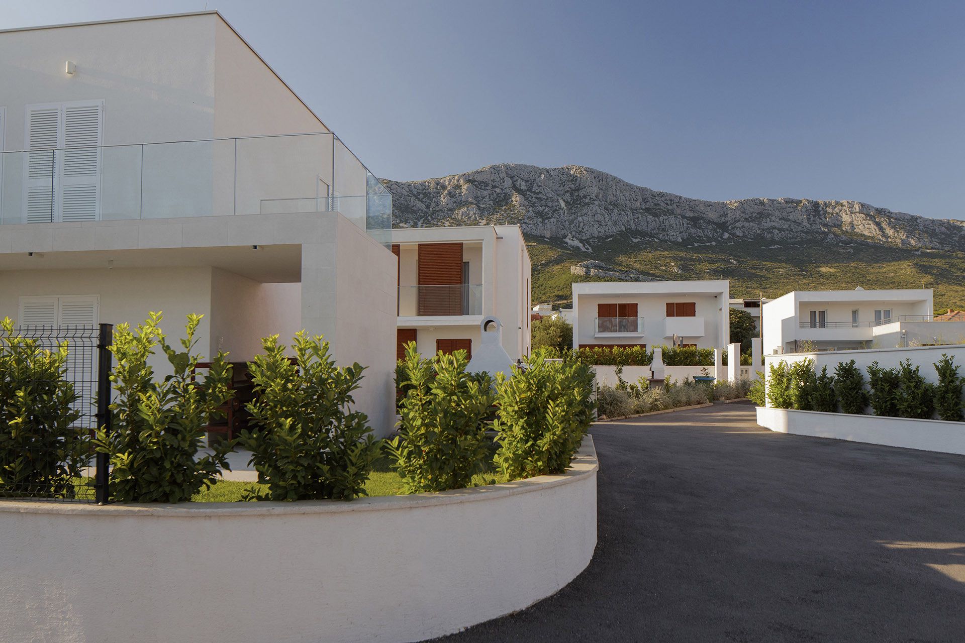 Kuće su oblikovane u funkciji kuće za odmor i sve je tome posvećeno. Fokus je na spoju vrta, bazena, terase, kuhinje, blagovaonice i boravka u jednu prostorno funkcionalnu cjelinu. To je osnova svake kuće – ugodni godišnji odmor, a sve drugo je nadgradnja. Ovisno o poziciji u naselju oblikovane su nadstrešnice i terase. Sve prostorije imaju južnu orijentaciju i uz pomoć promišljenih istaknutih dijelova dana im je privatnost i kadriran najbolji pogled.